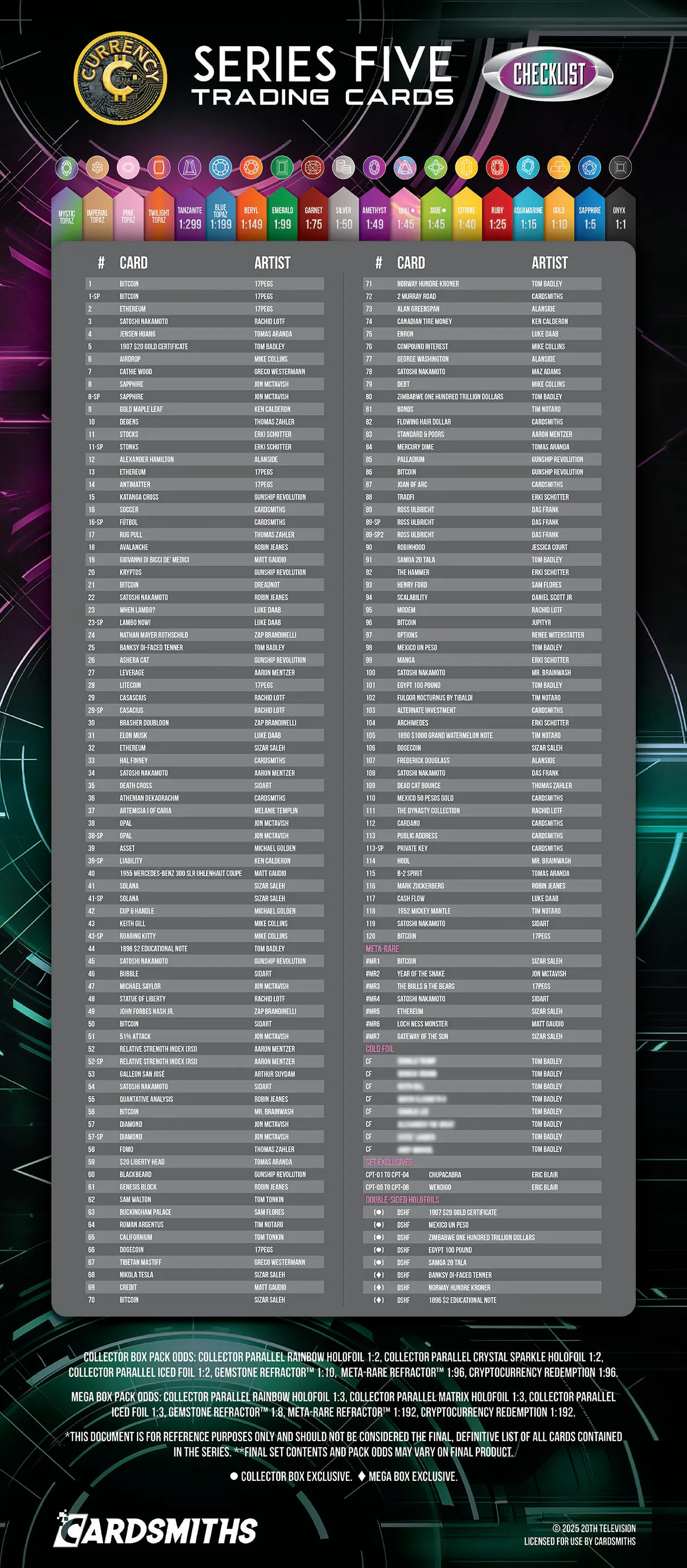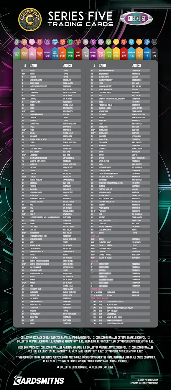 Currency Series 5 also features the largest-ever offering of Cryptocurrency Redemption Cards in Cardsmiths' history, exchangeable for varying amounts of Bitcoin, Ethereum, Litecoin, and Dogecoin, including major hits like 1 BTC and 1 ETH.